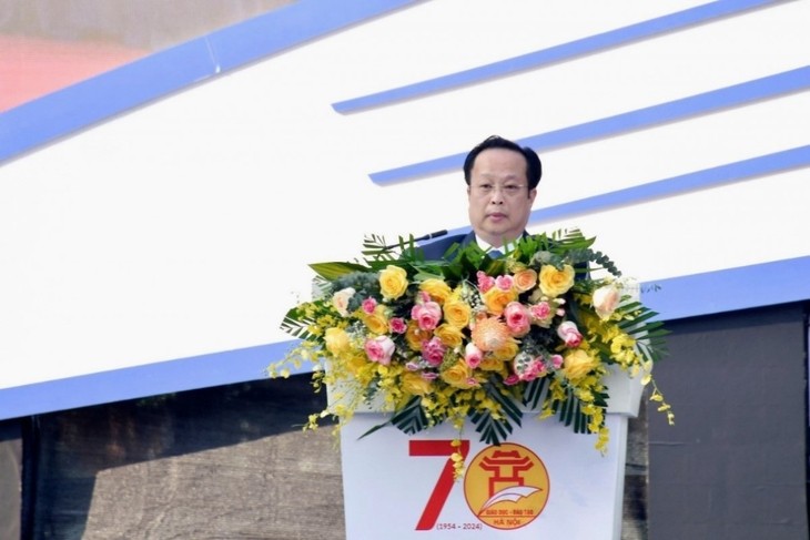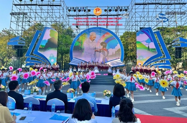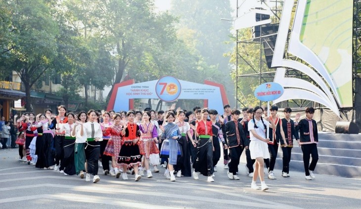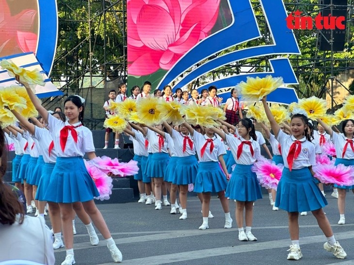 | In seiner Rede unterstrich der Direktor der Bildungsbehörde der Hauptstadt Hanoi, Tran The Cuong, dass dieses Programm den Stolz und den Patriotismus bei den Schülern von Hanoi weckt. Es motiviere ebenfalls die Lehrkräfte, kreativ zu sein und sich mehr für die Bildungsentwicklung anzustrengen. (Foto: VOV2) |