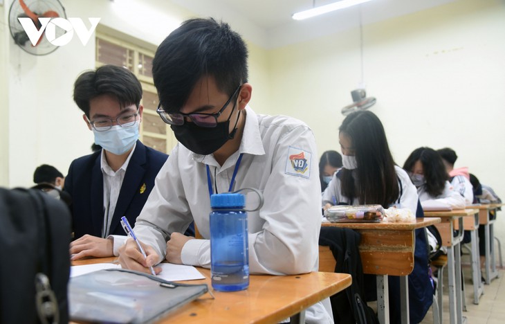 Alle Schüler der Oberschule Viet Duc im Stadtbezirk Hoan Kiem in Hanoi tragen Mundschutzmasken im Klassenzimmer. (Foto: VOV)