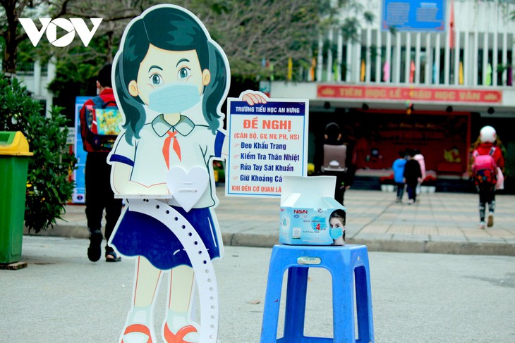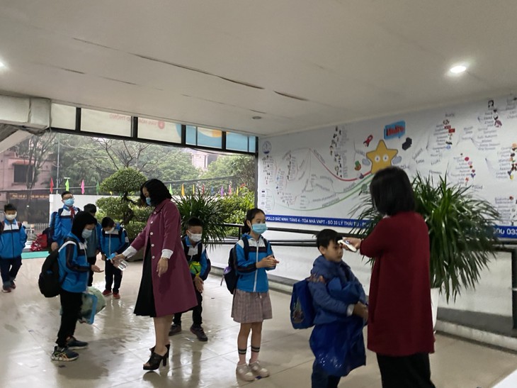 Im Kindergarten Nga Tu So in Hanoi bringen die Eltern am frühen Morgen ihre Kinder zur Schule. Die Kinder nehmen ihre Temperaturmessungen vor und desinfizieren ihre Hände, bevor sie das Klassenzimmer betreten. (Foto: VOV)
