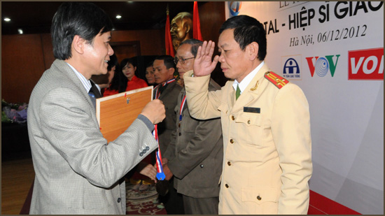 | Vize-Generaldirektor von VOV Vu Hai (l.) überreicht Oberstleutnant Le Duc Doan den Titel „Total- Der Verkehrsritter”. |