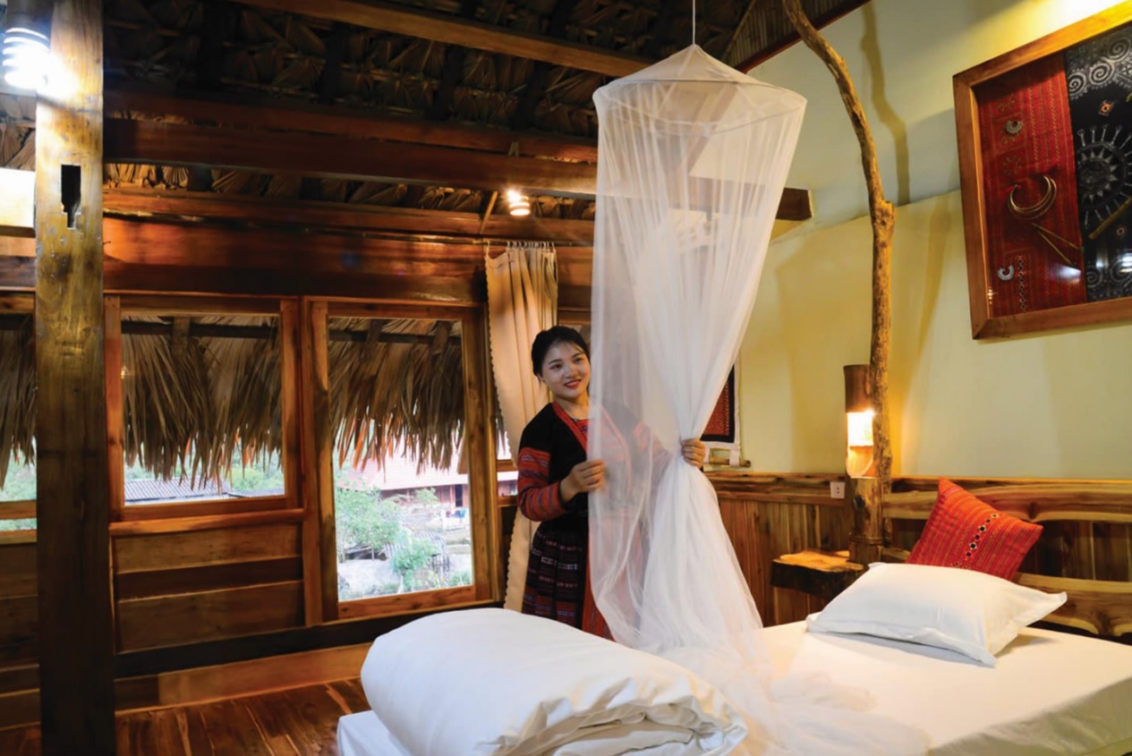 „Wir pflegen einen modernen Stil aber auch unsere Tradition. Die Wohnzimmer wurden mit Pieu-Tüchern und Taschen aus Brokaten dekoriert. Wir stellen den Gästen die Küche der Thai, Muong oder Mong vor. Wir haben unsere traditionellen Trachten, damit sich die Touristen wohl und näher füllen.“