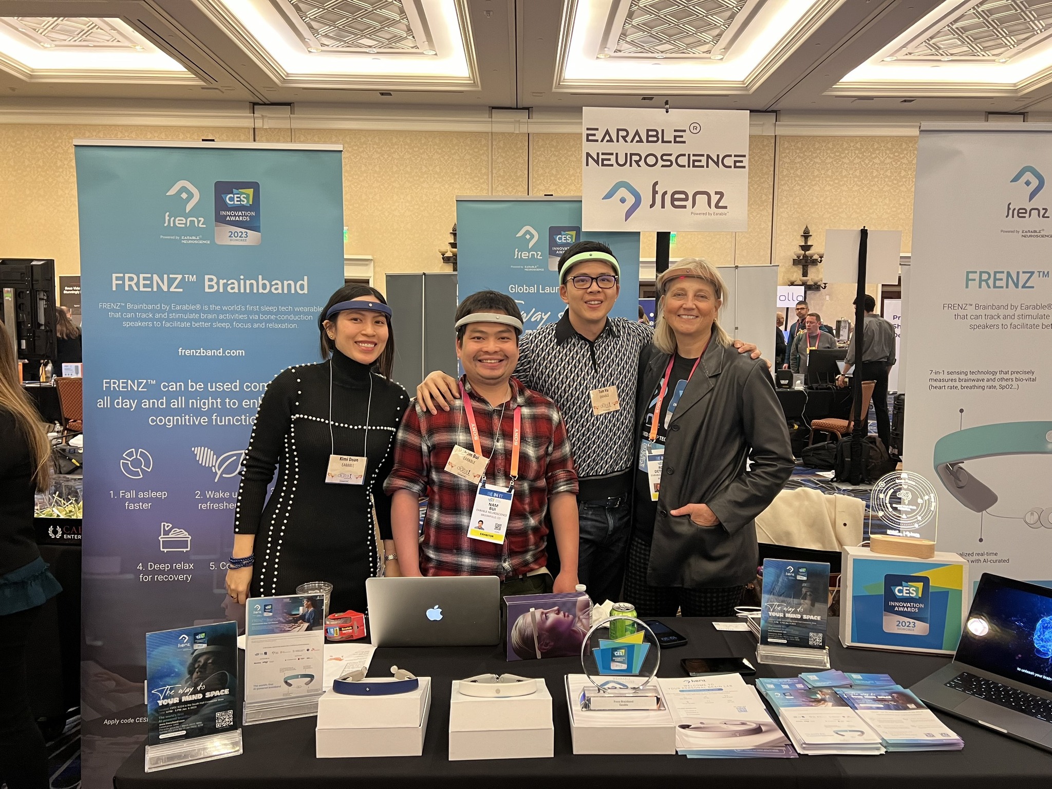 From left: Doan Kieu My, marketing director of Earable®, Nam Bui, PhD at Colorado University, and Tam Vu, the founder and CEO of Earable®, and Robin Deterding, Earable® co-founder, at the CES 2023 in Las Vegas. (Photo courtesy of Earable® Neuroscience)