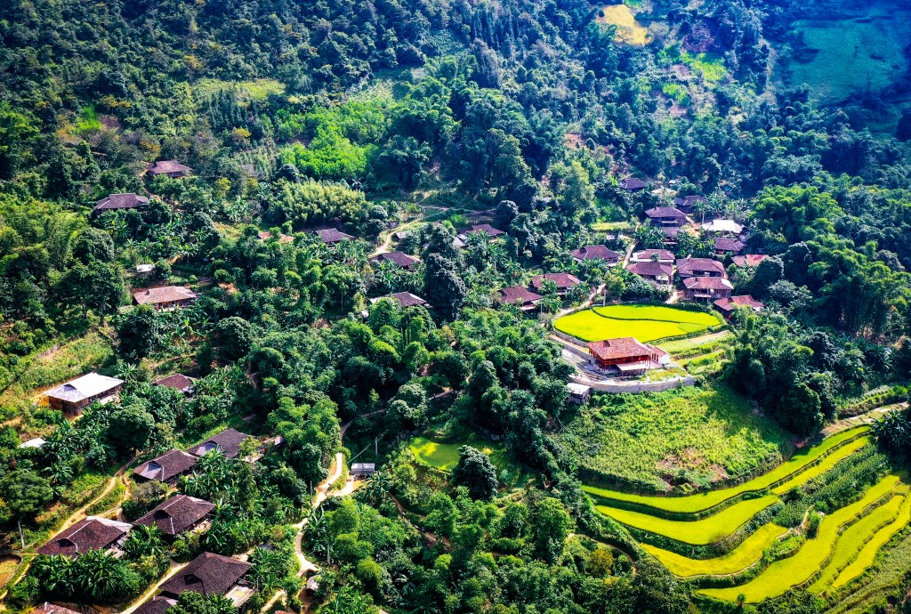 Khuoi Khon hamlet sits on a hill. Its 60 stilt houses, spaced about 10 meters apart, all facing the same direction. Narrow paths wind between the houses made of wood and bamboo and roofed with traditional yin-yang tiles. A typical house has five rooms, with its main entrance at the center. Villagers dry rice in their front yard. During the fifth lunar month all the villagers work together planting their fields.