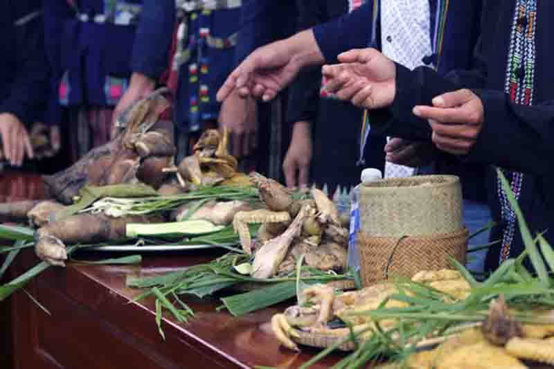 Ofrendas como pollo hervido y arroz cocido en tubos de bambú se colocan en una bandeja en el palafito principal para llevar a cabo la ceremonia de culto. (Foto: sggp.org.vn) |