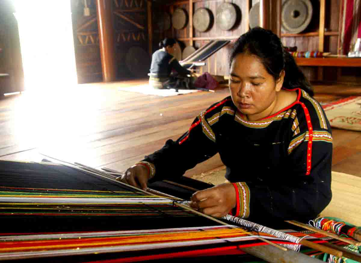 Telas de brocado tejidas a mano con estampados únicos por mujeres de la etnia Ede. |