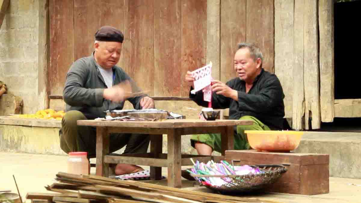 En la aldea de Nam Ooc, comuna de Nam Lu, distrito de Muong Khuong, los lugareños conocen a Vang Van Chien como una persona conocedora de los papeles votivos y, a menudo, ayuda a las familias del poblado a confeccionar estas obras durante los funerales. Chien compartió que casi todos los hombres de su aldea saben cómo hacer papeles votivos.