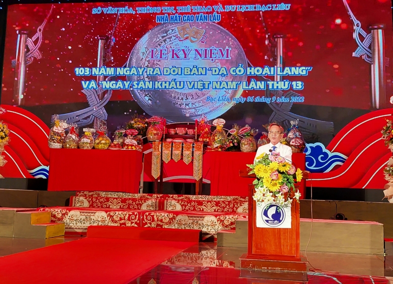 El secretario del Comité del Partido de Bac Lieu, Lu Van Hung, habla en el programa artístico para celebrar el 103 aniversario del nacimiento de “Da co hoai lang” y el 13.° aniversario del Día del Teatro de Vietnam. (Foto: VOV) |