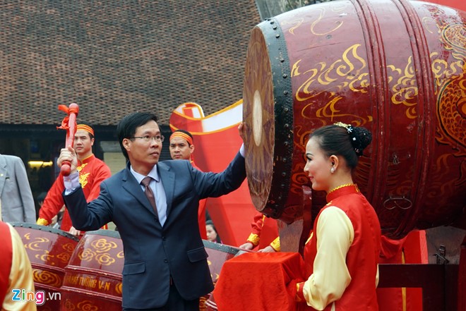 ![]() Vo Van Thuong, miembro del Buró Político del Partido Comunista de Vietnam y jefe del Departamento de Propaganda y Educación del Comité Central del mismo toca el tambor dando inicio al Día Nacional de la Poesía