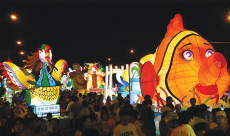 Un caravana con gigantescos faroles en el Festival de la Luna