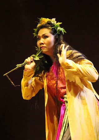 Están escuchando una grabación citada de la obra “Xuy Van gia dai” (Xuy Van, la loca) que cuenta de una muchacha llamada Xuy Van. Este trozo resalta sus sentimientos infelices, que de no ser correspondida en el amor, desea dar por acabada la relación matrimonial para perseguir un nuevo romance. Los actores de la obra son de la conocida compañía “Dong Kinh co nhac” (Música antigua de Dong Kinh). En ese sentido, la noche musical “To nu dan ca” tiene como fondo pinturas populares hechas en el papel “do” del pintor Ly Truc Son, las cuales están actualmente expuestas en el Centro Cultural Francés, Hanoi. Responsable de la decoración y el montaje del escenario, el mismo artista comenta que su manera de decorar el escenario tan particular y lleno de improvisación era como un valor añadido al programa y fue creado apenas un rato antes de que empezara el mismo. “Antes de pintar no tenía muchas ideas, sino que las mismas fueron creadas una tras otra en el momento. Esperé hasta que el telón de fondo fue montado para organizarlas, es como un método de actuación: cuando ocurre un acontecimiento, el actor lo representa en el escenario en el acto. El artista capaz de improvisar, lleva dentro el material y la habilidad, y cuando toca el instante concreto, lo demuestra todo.”