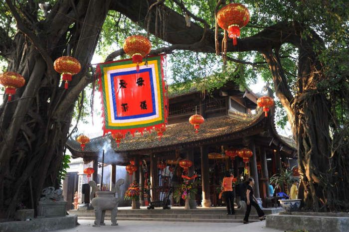 El ambiente aquí es solemne y pacífico, con el aroma a incienso y los sonidos de los pájaros. En su patio se encuentran muchos árboles viejos, especialmente un tronco compuesto por un baniano y dos laureles de la India, todos de 800 años de edad. Según Nguyen Thi Lien, una guía turística, este fenómeno es único en toda la región norteña del país. Sus raíces crecen y forman tres patas muy sólidas, como si fuera una mano de la Diosa Madre, agregó.