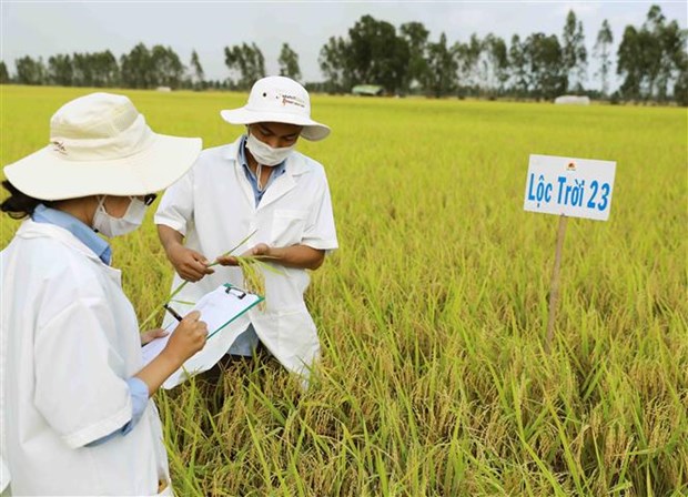 Ingenieros evalúan la calidad de las variedades de arroz desarrolladas por el Instituto de Investigación Agrícola Loc Troi, en la provincia meridional de An Giang. Foto: VNA) |