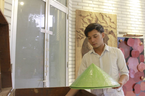 Un día, durante un viaje en barco por el lago Tinh Tam, Thao descubrió las características de las hojas de loto: resistentes, gruesas y especialmente emblemáticas de Hue, su ciudad natal. Él reveló: “Inicialmente quería pintar en hojas de loto, pero parecía que era demasiado común. Luego, buscando algo mejor, me di cuenta de que esta variedad era ideal para hacer sombreros cónicos, un accesorio típico de las mujeres Hue”.