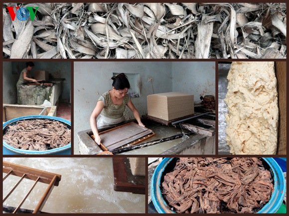 Cada año, pobladores de esas localidades recolectan plantas del papiro que se centran en las provincias norteñas de Yen Bai, Lao Cai, Thai Nguyen y Cao Bang. Primero, el tallo de la planta del papiro se mantienen en remojo entre una y dos semanas (cuantos más días esté en remojo, más marrón quedará el papiro final). Después se cortan en finas tiras llamadas “phyliae” y se pulverizan con un majadero para eliminar parte de la savia y otras sustancias líquidas. Luego, se mezcla ese polvo con agua y savia de la planta "clerodendron" para crear un mixtura gelatinosa.