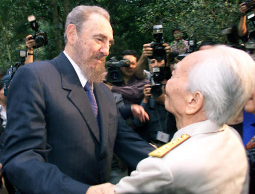 El presidente de Cuba, Fidel Castro saluda al general Giap