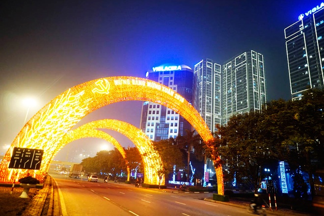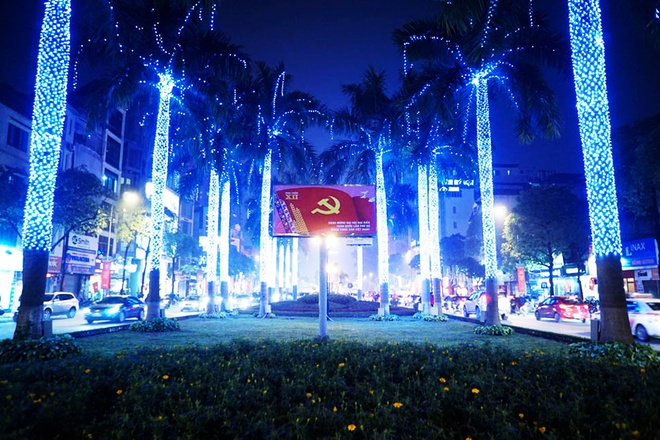 La acera de calle Dinh Tien Hoang, al lado del lago Hoan Kiem, es decorada con una fila de letras luminosas “Mung Dang mung Xuan”, que significa celebración por el Partido y el Año Nuevo Lunar |