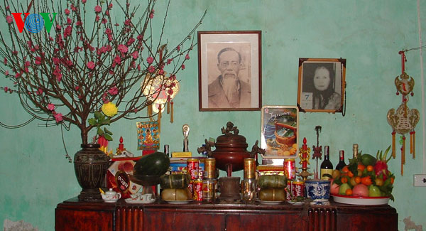 | El altar de cada familia vietnamita en los días festivos del Tet no puede faltar la bandeja de frutas, el pastel tradicional banh chung, y un ramo de flores de melocotón |