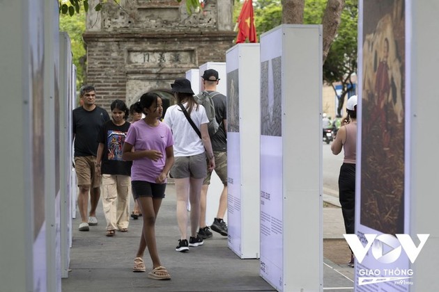 Una exposición de fotografías en la calle peatonal del lago Hoan Kiem. |