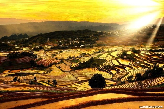 Los campos de arroz en terrazas se ven fascinantemente hermosos al atardecer. (Foto: laichau.gov.vn) |