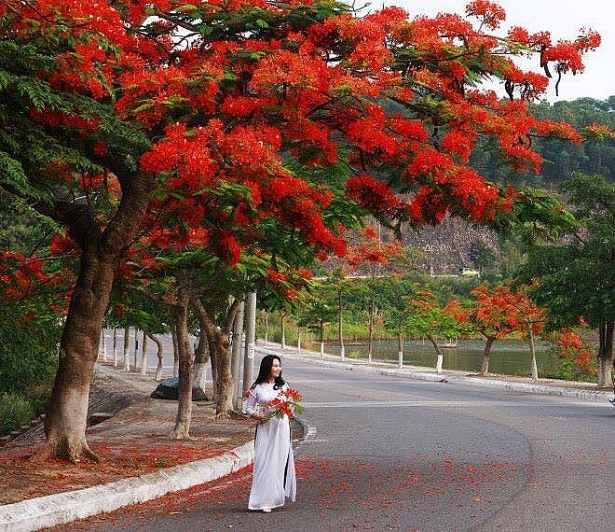 Una mujer de Hai Phong luce la túnica tradicional Ao Dai en un camino embellecido por los árboles de flamboyán. |