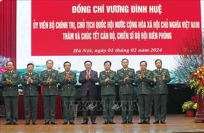 El presidente de la Asamblea Nacional, Vuong Dinh Hue, y dirigentes del Mando de la Guardia Fronteriza. (Foto: VNA) |