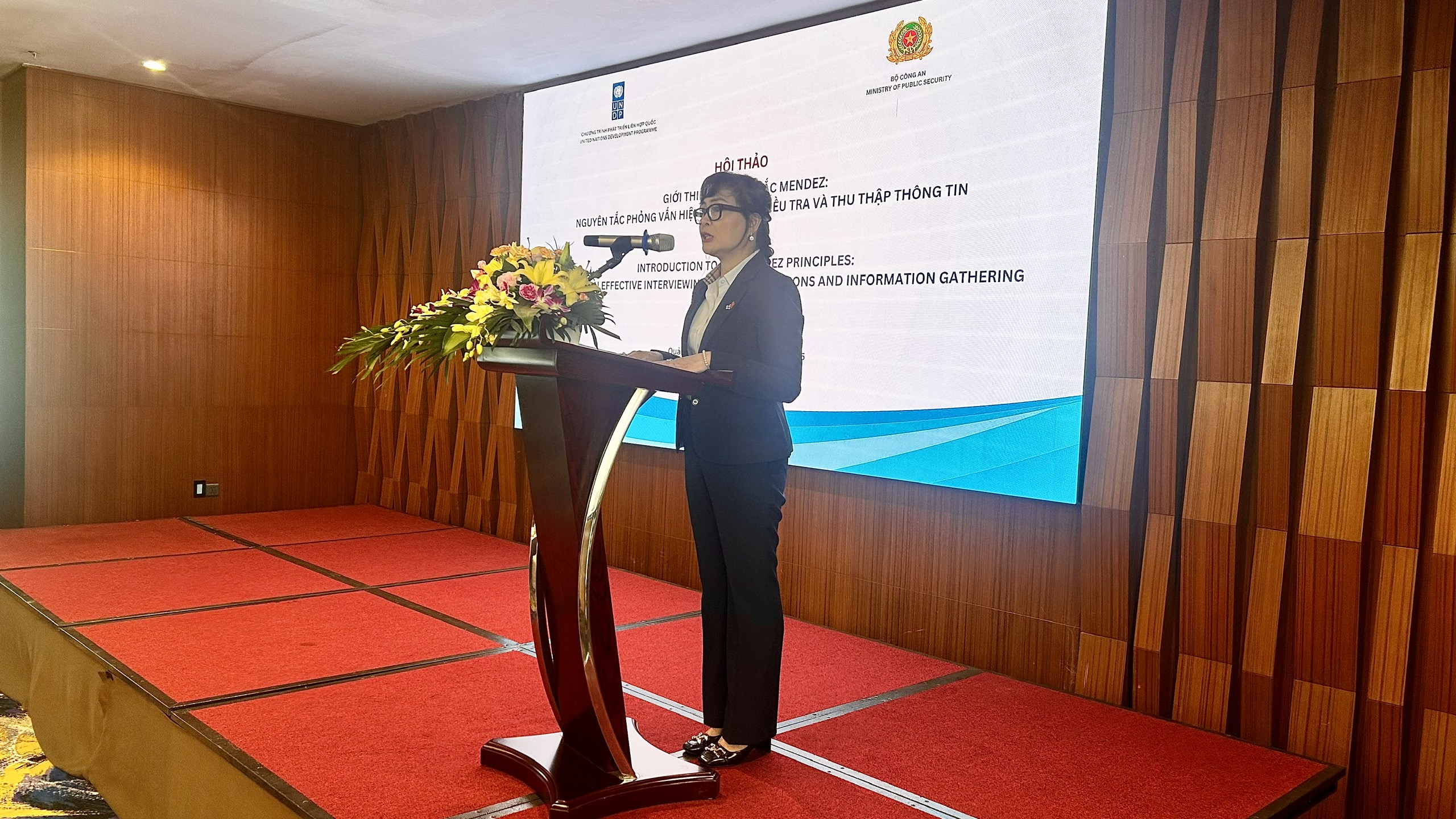 La primera coronela Nguyen Thi Thanh Huong, jefa del Departamento de Temas Especiales de Derechos Humanos, Departamento de Asuntos Exteriores, del Ministerio de Seguridad Pública, interviene en el taller. (Foto: Comité Organizador) |