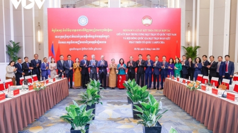 (VOVWORLD) - La presidenta del Comité Central del Frente de la Patria de Vietnam, Bui Thi Minh Hoai, y la vicepresidenta del Partido Popular de Camboya, Men Sam An, copresidieron hoy en Hanói las conversaciones oficiales y la firma del acuerdo de cooperación entre ambas organizaciones del Frente para el período 2026-2031.