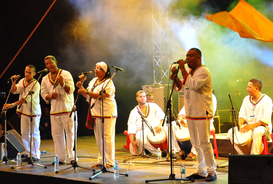 Los artistas del Grupo venezolano "Los Tambores de San Millán" interpretan