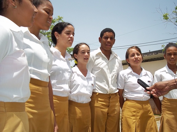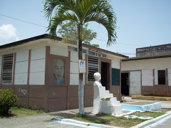 Al entrar supe que la efigie pertenece a la Escuela Secundaria Básica Urbana (ESBU) Ho Chi Minh, enclavada allí; el termómetro marcaba los 30, 6 grados Celsius, y el reloj las 10 y 45 de la mañana; justamente empezaba el receso escolar. Poco a poco la tranquilidad fue cediendo, y en breve la algarabía se generalizó en el interior del recinto.