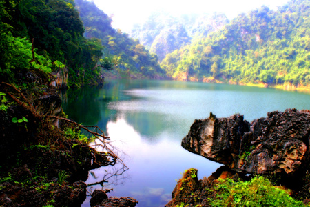 Las aguas represadas del río Da, necesarias para la enorme hidroeléctrica construida en los años 80 del siglo pasado, transformaron el paisaje en un lago rodeado por montañas, del cual emergen mogotes, islas y otros accidentes.