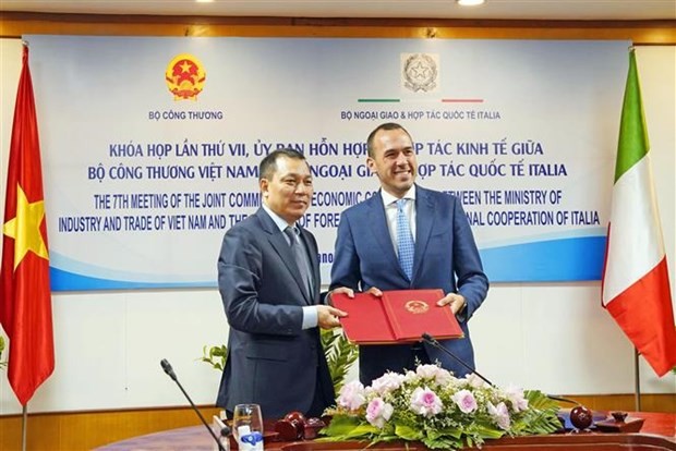 El viceministro de Industria y Comercio Dang Hoang An (i) y el vicetitular de Asuntos Exteriores y Cooperación Internacional de Italia, Manlio Di Stefano, en la reunión del Comité Conjunto de Cooperación Económica entre ambas naciones, el 7 de junio pasado. (Foto: VNA)