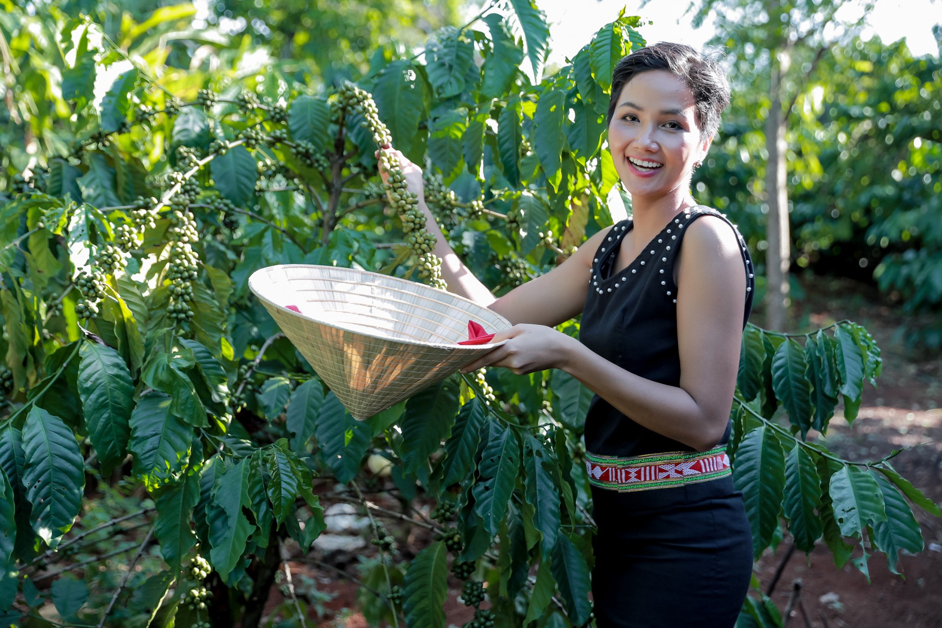La miss vietnamita H'Hen Nie con el traje de brocado tradicional de la etnia Ede, recogiendo café en un huerto. (Foto: afamily.vn) |
