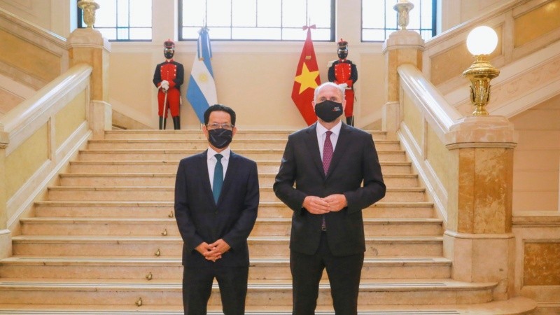 El embajador vietnamita en Argentina, Duong Quoc Thanh (i), y el gobernador de la provincia de Santa Fe, Omar Perotti. (Foto aportada por Hugo Longhi) |