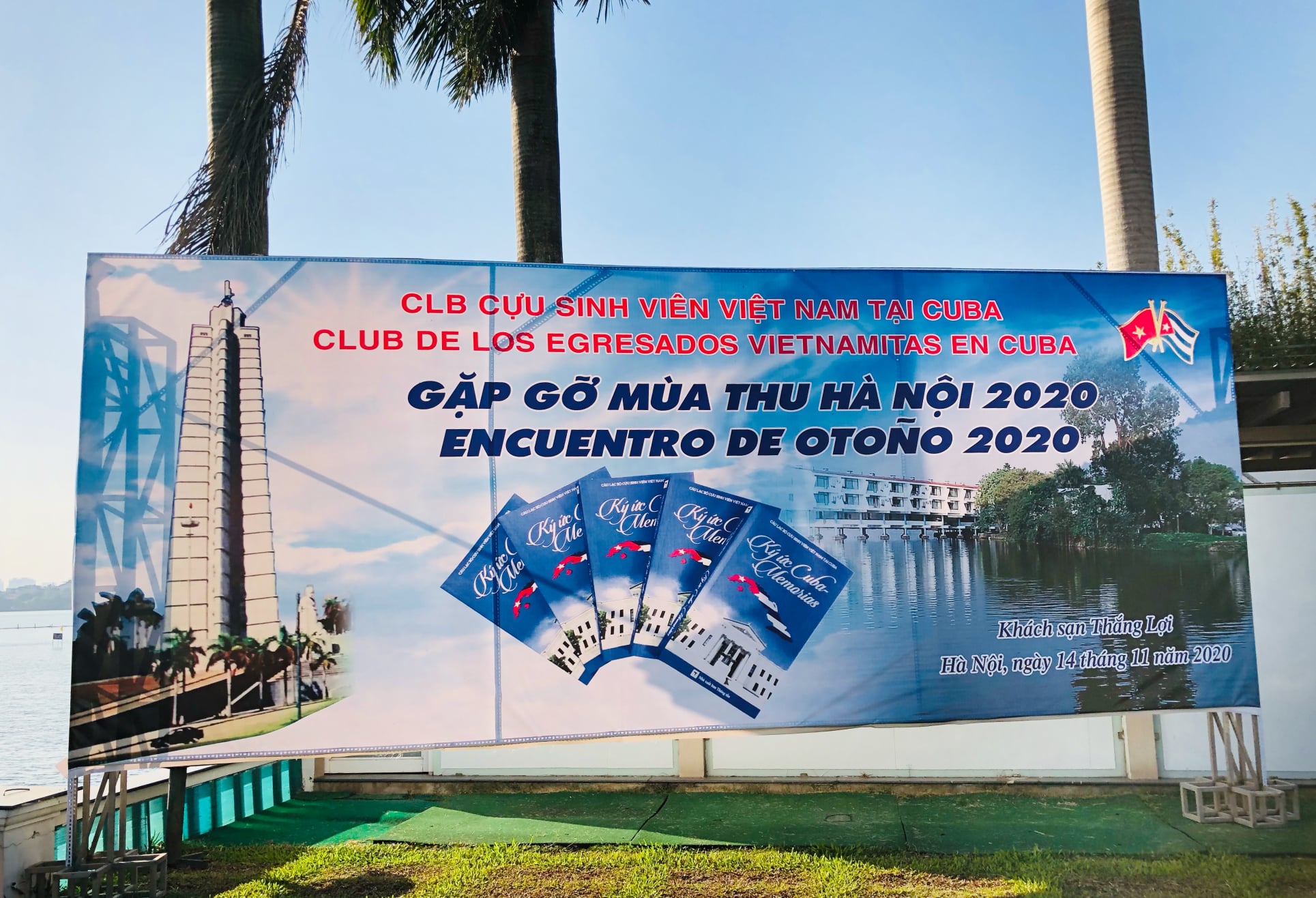 La imagen del libro "Memorias sobre Cuba" se imprime en el panel del encuentro de los egresados vietnamitas en Cuba en 2020. (Foto: Facebook "Ky uc Cuba-Memorias") |