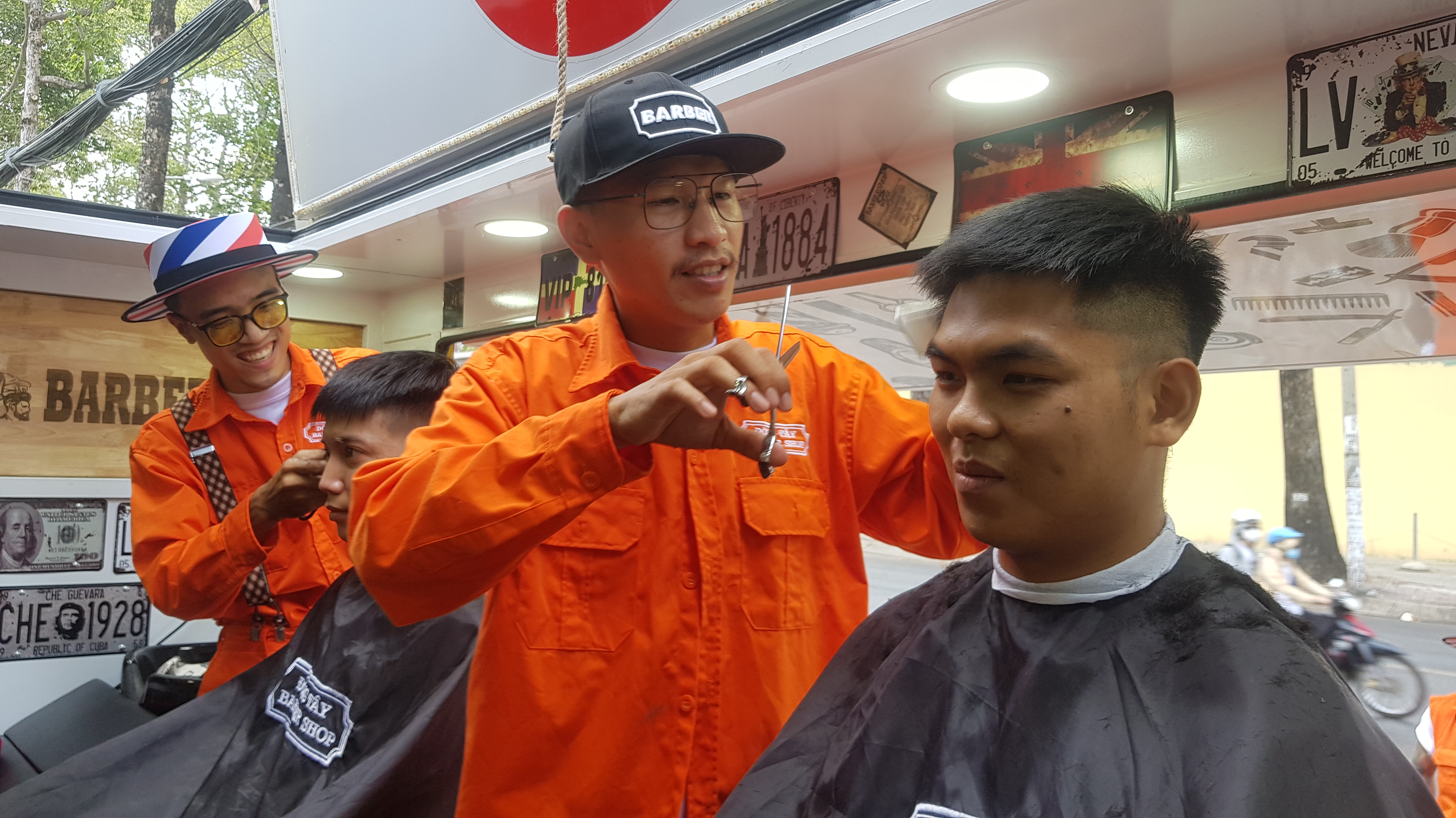 En un pequeño camión bien diseñado, dos jóvenes peluqueros muy profesionales con un uniforme naranja, cortan cuidadosamente el cabello de un chico y una chica. Este “salón de belleza” especial también está pintado en un llamativo color naranja, estacionado justo al lado de la Universidad Tecnológica de Ciudad Ho Chi Minh. La peluquería tiene un espacio reducido, justo para dos sillas, dos mesas con espejos y algunas herramientas necesarias, pero debido al diseño abierto y elegante, los clientes se sienten cómodos. Afuera, justo al lado de un letrero de madera que dice “Peluquería del estudiante 2k – Dong Tay Barbershop”, algunos jóvenes esperan su turno en la fila.