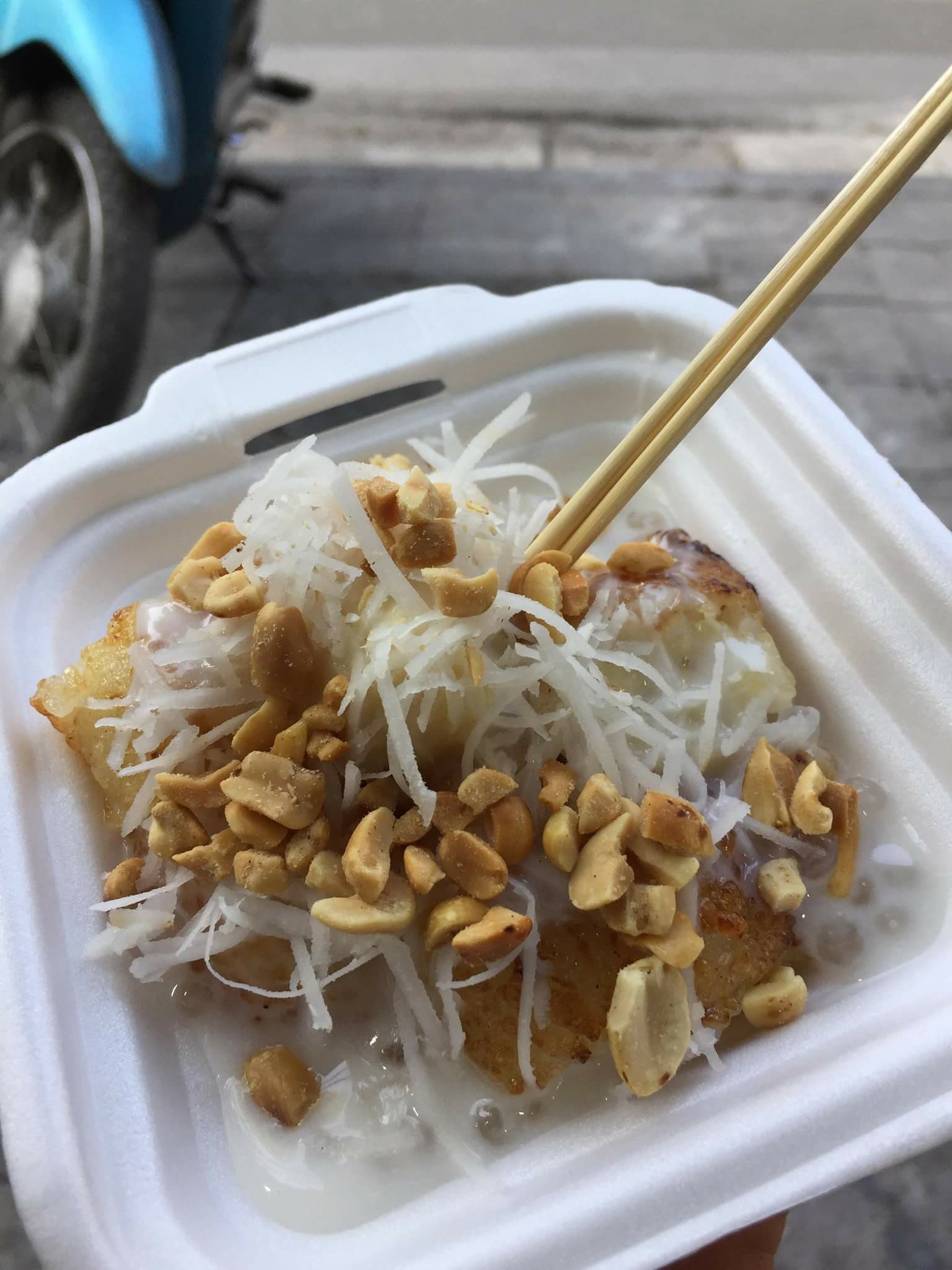 Para disfrutar de este postre, los cubos de plátano generalmente se cortan en trozos pequeños, se rocían con crema de coco espesa y se espolvorean con cacahuetes tostados triturados encima. El olor a plátano asado mezclado con la grasa, dulzura y fragancia del coco hace que los transeúntes también duden en caminar.