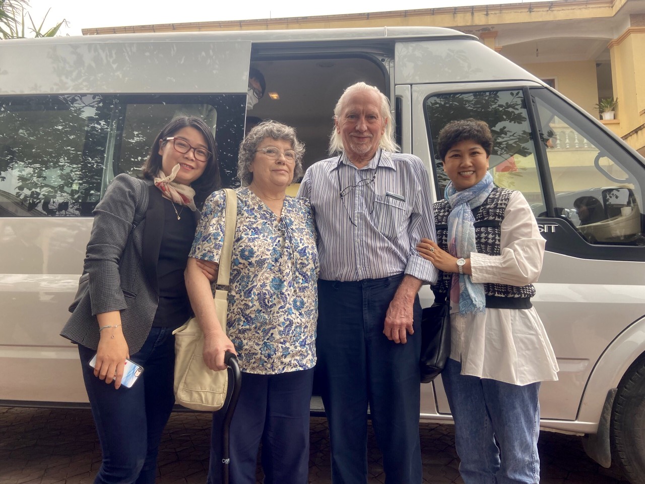 Las periodistas Thu Hoa (primera desde la izquierda) y Quynh Hoa (primera desde la derecha) se toman una foto de recuerdo con Peter Mathews y su esposa. |