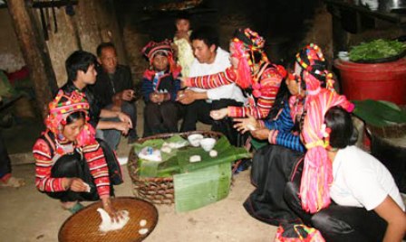 Durante las ceremonias, en la bandeja de ofrendas se sirven, además de los alimentos principales, chiles, ensalada con carne de cerdo, verduras y brotes de bambú hervidos a vapor. Antes de comer, los niños se colocan en fila para desearles salud y prosperidad a sus abuelos y padres. Entonces, los miembros de la familia conversan y se invitan mutuamente a beber y probar diferentes platos. Todo se hace en un ambiente alegre y cálido. Para los miembros de la etnia, el Tet también es una ocasión para las reuniones familiares, en las que olvidan los problemas del año viejo y piden que el nuevo les traiga mucha salud, suerte y abundantes cosechas.