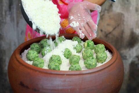 Para hacer bolas de arroz glutinoso, los principales ingredientes son harina de arroz glutinoso, semillas de soja verde, carne de cerdo y hojas de “khuc” (Gnaphalium indicum). Para preparar la corteza, se lavan las hojas de khuc, se machacan bien y luego se mezclan con harina de arroz en proporción para formar la masa. Las semillas de judía mungo se mojan en el agua durante unas horas, para luego lavarse y pelarse con cuidado antes de ponerse al vapor, hasta que estén bien hechas. Se trituran para hacer una pasta. Su relleno incluye la pasta de soja verde, pedacitos de carne de cerdo salteada y un poquito de pimienta, todo recubierto por la masa preparada. Después de formar bolas, estas se cubren con arroz glutinoso, se colocan en una olla y se cocinan al vapor.