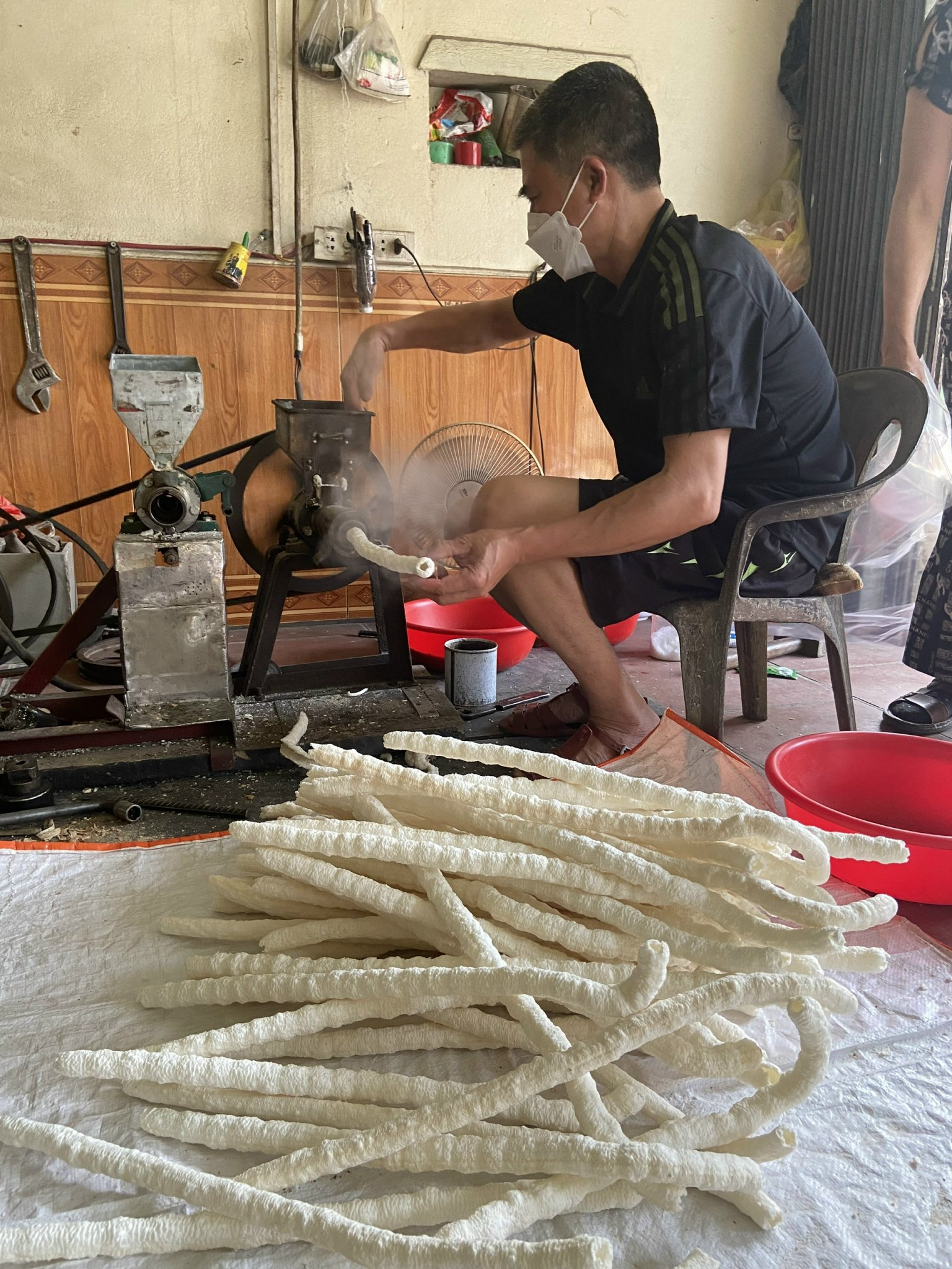 Después de que los ingredientes se mezclan a mano en una cuenca de plástico grande, se vierten gradual y hábilmente en el embudo de la máquina. Estos ingredientes serán triturados y pegados al calor. Solo unos segundos después, los “bong gay” largos y calientes salen del tubo de la máquina. Entonces, Dinh Van Phu, el esposo de la señora Hien, los extiende con una mano y con las tijeras en otra, los corta en palitos uniformes, generalmente de 55 a 60 centímetros de largo y dos centímetros de diámetro, aunque dependiendo de las preferencias de los clientes, también pueden ser más cortos.