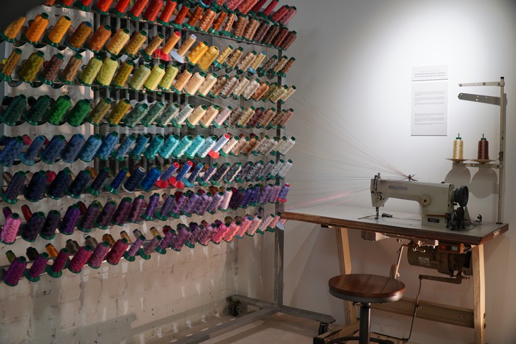 Todas las fotos y artículos que se mostraron en el evento se realizaron bajo el único tema: “conexión”. En el primer piso, los visitantes encontraron un prototipo de máquina de coser donde todos los hilos están enlazados entre sí, lo que simboliza la conexión de las personas durante esta pandemia.