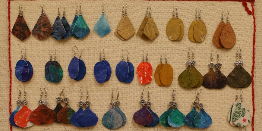 “Para hacer los aretes más atractivos, también opto por agregarles hojas como las de papaya, de perilla, o de momordica que se secan a la sombra durante un buen tiempo para que no queden quebradizas. Una vez que tengo los materiales, los cuales son cartones de colores prensados de bolsas de plástico, trapos u hojas secas, los aplico a un juego de moldes para crear aretes con diferentes formas como por ejemplo pueden ser: triángulos, gotas de agua o algunos diseños de acuerdo a pedido exclusivo de los compradores”.