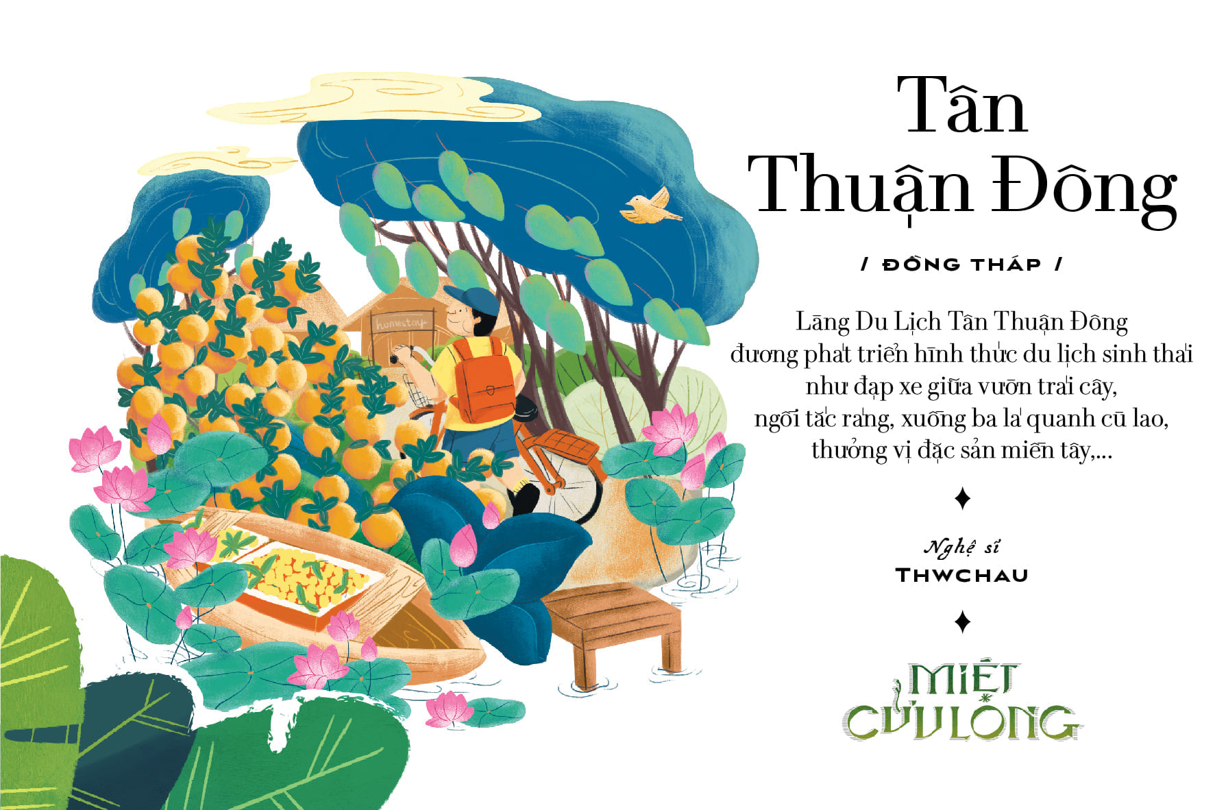 “Estudié y pinté los sitios durante más de medio mes. A diferencia de otros artistas, en lugar de realizar el esbozo en papel, los dibujé en el ordenador. Elegí la aldea turística de Tan Thuan Dong y el jardín de mangos My Xuong, con el objetivo de mostrar la hospitalidad y la amabilidad de los agricultores locales. Me siento emocionada de presentar la cultura de mi hogar a través del proyecto de Vuong Vinh”.