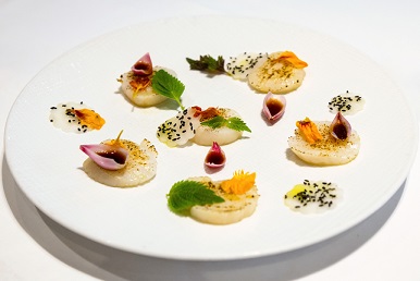 Chef: For the scallop, we use US scallop, we slice the scallop and we burn the scallop, then we marinate with ponzu, which is the Japanese soya sauce and we decorate it with edible flowers from Da Lat.
