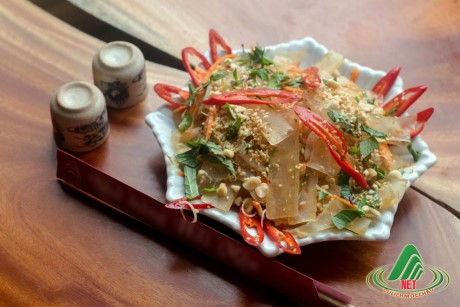 B: It is, but it’s worth the effort. Mrs. Hoang ThiTheu, who cooked the dish for me, said that it took a month for one batch of fermented buffalo skin. Theuwill explain how to prepare the dish. “The skin should be fresh skin taken from a 6 to 7-year-old male buffalo. The skin is first held over a fire to burn all the hair off. Scrape off the burnt part of the skin pieces until it turns pale yellow and soak it in cold water for an hour. The skin is then boiled for an hour over a medium fire before soaking it in salt water.The boiled skin is then sliced into thin pieces and soaked in warm water mixed with lemon juice to make it soft and fragrant.”