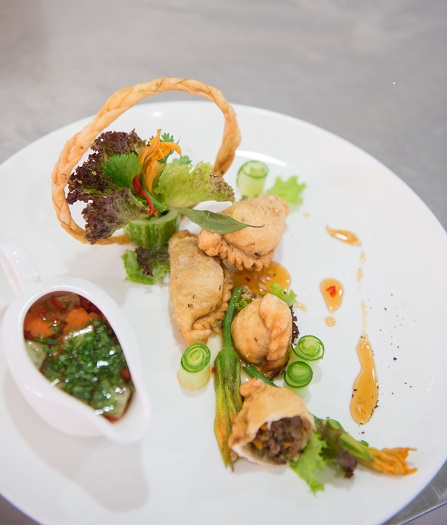 The taste of the fried pillow cake is balanced with a dipping sauce made of garlic, chili, sugar, vinegar, fish sauce, and water. Using the required ingredients at the competition, Tra and Binh created their own dipping sauce, which really impressed the jury panel: “We used red wine to replace the traditional vinegar, and surprisingly, the taste went well with the cake. We also make a second thicker sauce using traditional Vietnamese spices for foreigners who are not familiar with dipping sauces”.
