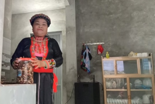 B: The jar is sealed using layers of Dong and banana leaves to prevent air from getting in, so that the salting process can happen. Dang Thi Tien is a Red Dao woman who is experienced in making this dish. She said: “I make salted pork every year, when Tet comes. The ingredients are simple: pork, herbs, and salt. In the past, salt pork was a staple in most households before we had refrigeration. We marinate meat with a lot of salt to keep it longer, from 2 to 3 months. This dish is very delicious and satisfying to people of all ages.”