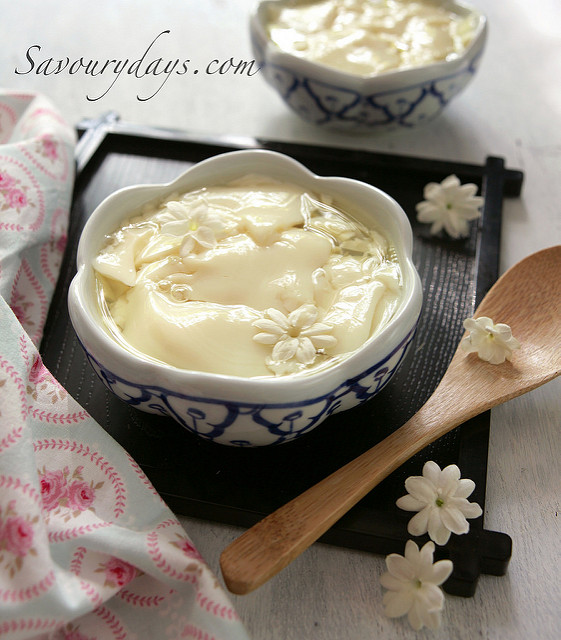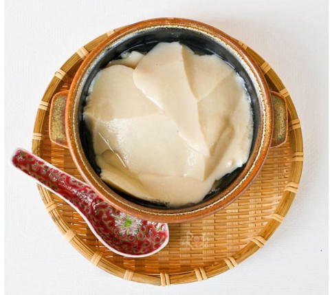 A: True. Tofu pudding should be served right away with spicy ginger syrup, coconut water, or black bean sweet soup. The syrup will be more fragrant if you add some jasmine or pomelo flowers.