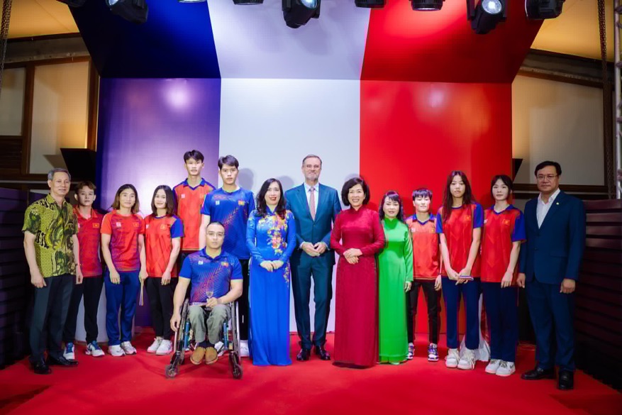 Olivier Brochet, Lê Thi Thu Hang et des athlètes vietnamiens qui se préparant à partir pour les Jeux olympiques et paralympiques de Paris 2024. Photo: @Ambassade de France |