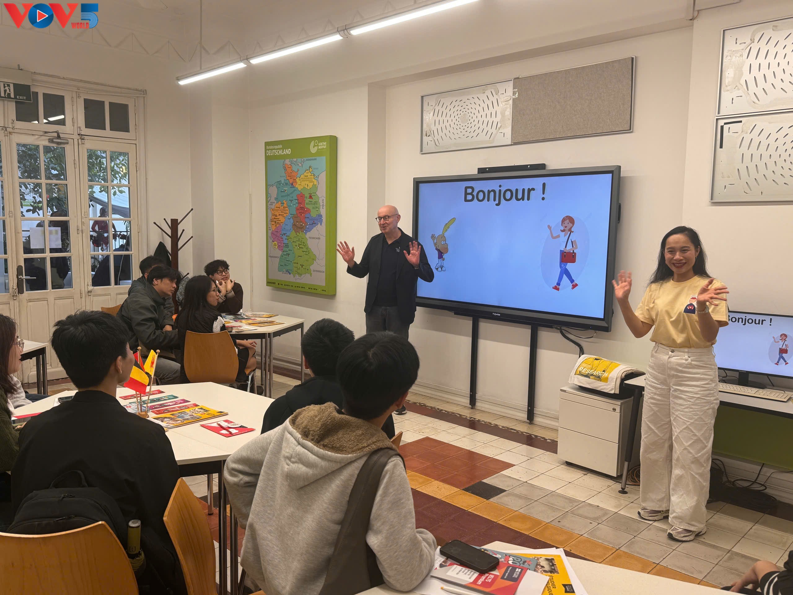 Pierre du Ville, chef de la Délégation générale Wallonie-Bruxelles au Vietnam (gauche) et Bui Thi Ha Giang, enseignante de la classe. Photo: Thùy Linh/VOV5 |